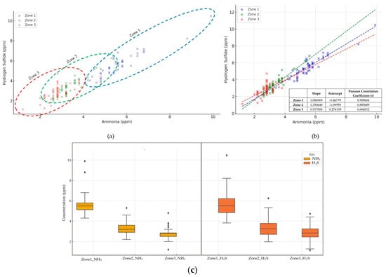 (a) Correlation of concentrations between NH3 and H2S in pig housing. (b) Statistics of the relationship between NH3 and H2S: (Zone 1) with no environmental control (natural ventilation), (Zone 2) with ventilation fans but no water spraying system, and (Zone 3) with both ventilation fans and a water spraying system on the roof. (c) ANOVA-based comparison of gas concentrations across different zones represents the concentration of NH3 and H2S.