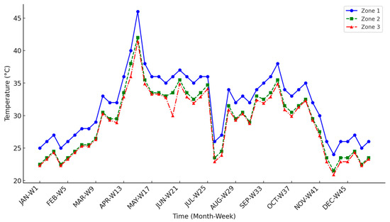 This study provides valuable insights into the temperature dynamics within three distinct pig housing zones, each characterized by different environmental control strategies (Figure 6). Zone 1, which lacked both ventilation and a roof-mounted water-spraying system, recorded an average indoor temperature of approximately 31.81 °C. This elevated temperature is attributed to solar heat gain and insufficient ventilation, particularly during the sweltering summer months in Thailand.