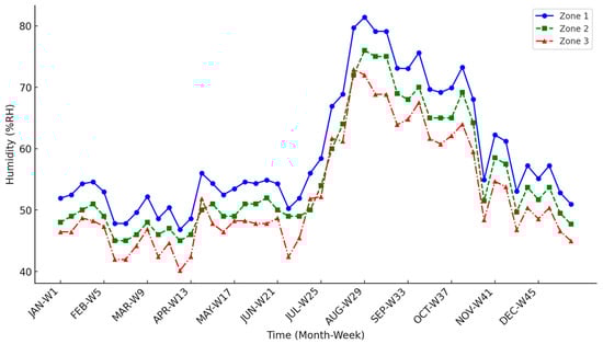 Humidity (%RH) of pig housing (Zone 1) with no environmental control (natural ventilation), (Zone 2) with ventilation fans but no water spraying system, and (Zone 3) with both ventilation fans and a water spraying system on the roof.