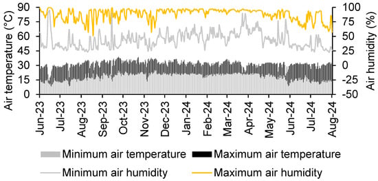 The field experiment was carried out in the experimental area at the Federal University of Mato Grosso do Sul, located in the municipality Chapadão do Sul, Brazil, at 18°46′44″ S, 52°36′59″ W and an altitude of 820 m. The region’s climate is classified as tropical humid (Aw type) according to the Köppen classification, with a rainy season in summer and a dry season in winter [20]. The average rainfall is 1850 mm and the average annual temperature is between 13 °C and 29 °C [21]. Throughout the experiment, air temperature and relative humidity measurements were made (Figure 1).