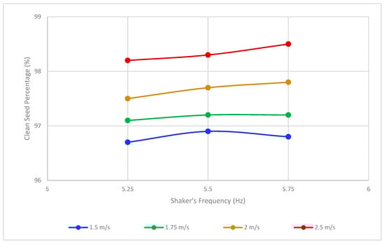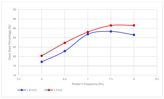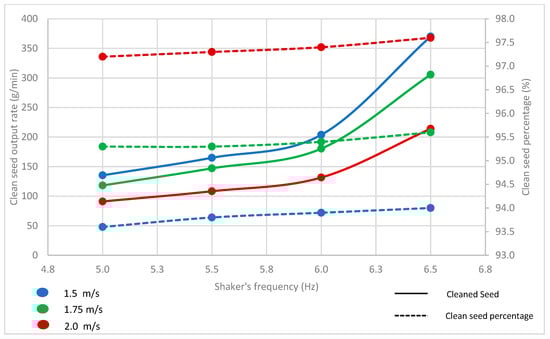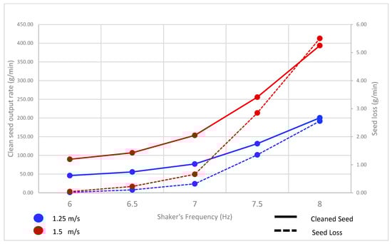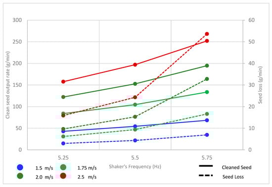 | Shaker Frequency (Hz) | Airflow (m/s) | Operation Time (s) | Clean Seed per Hour (g/min) | Seed Loss per Hour (g/min) | Clean Seed Percentage (%) | |