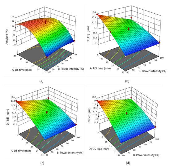 Figure 1. Response surfaces of the combined effects of sonication time and power intensity on (a) apparent amylose content (%); (b) area-weighted mean diameter (D[3;2]); (c) volume-weighted mean diameter (D[4;3]); and (d) mean particle diameter at 50% of cumulative volume (Dx50) values for the single ultrasound (US)-modified starch.