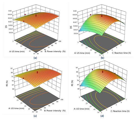 Figure 2. Response surface of the combined effects of sonication time and power intensity (a,b) and sonication time and reaction time (c,d) on the degree of substitution (DS) and reaction efficiency (RE) values for the dual-modified starch.
