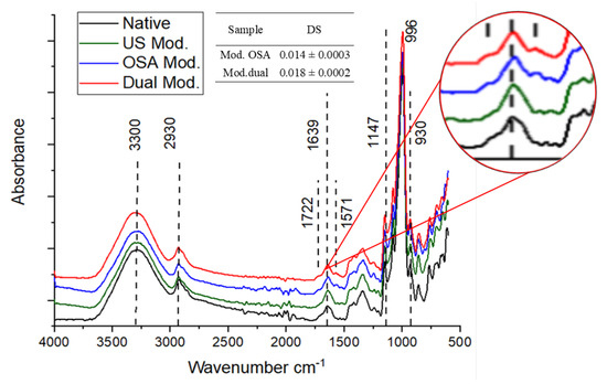 Figure 3. FTIR spectra for native and modified starches. Key: Native, native starch; US Mod., single ultrasound (US) modification; OSA Mod., single octenyl succinic anhydride (OSA) modification; Dual Mod., dual modification (modification US followed by OSA).