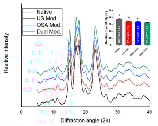 Figure 4. X-ray analysis for native and modified starches (i.e., Mod. US, Mod OSA and Mod. Dual). Key: RC, relative crystallinity; Native, native starch; US Mod., single ultrasound (US) modification; OSA Mod., single octenyl succinic anhydride (OSA) modification; Dual Mod., dual modification (modification US followed by OSA). Different letters in columns represent values with statistically significant difference at 5% (p ≤ 0.05).