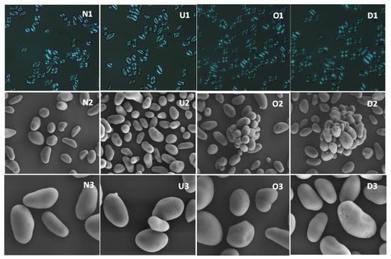 Figure 5. Micrograph at 40× with polarized light (N1, U1, O1 and D1) and SEM of starch granules at 2000× (N2, U2, O2 and D2) and 5000× (N3, U3, O3 and D3) of native (N), US-modified (U), OSA-modified (O) and dual-modified (D) starches.