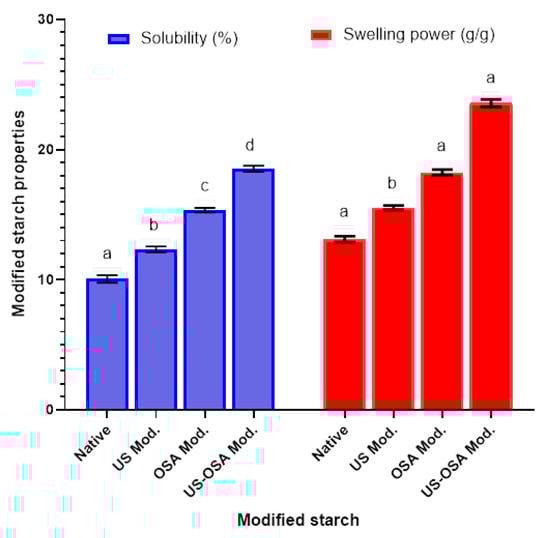 Figure 6. Solubility and swelling power, of native and modified starches. Key: Native, native starch; US Mod., single-ultrasound (US) modification; OSA Mod., single octenyl succinic anhydride (OSA) modification; Dual Mod., dual modification (modification US followed by OSA). Different letters in columns represent values with statistically significant difference at 5% (p ≤ 0.05).