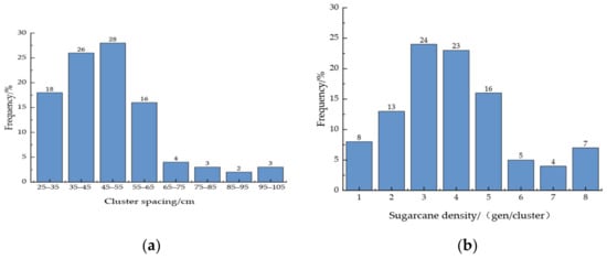 Statistical results of sugarcane growth: (a) histogram of cluster spacing frequency distribution; (b) histogram of sugarcane density frequency distribution.