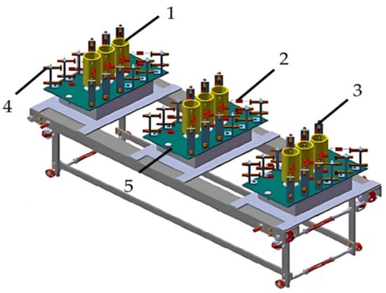 Figure 3 shows the model of a sugarcane transport trolley, which primarily consists of multiple sugarcane sleeves, tension springs, fixed brackets, bolts, sugarcane pads, and other components. To better simulate the force of stubble in the soil, the cane sleeve is fixed by 8 springs, each of which can be adjusted by bolts to modify the tightness. Threaded holes in the cane sleeve allow different diameters of the cane to be tightened by bolts, preventing the stubble from moving vertically. The trolley can transport up to 3 clusters of 9 canes at a time. The spacing between each nest of canes is adjustable, with a minimum spacing of 330 mm for two clusters and a maximum spacing of 900 mm. The minimum distance between two canes in a cluster is about 10 mm. Comparing these parameters with the sugarcane growth statistics, it can be seen that the cane conveyor trolley’s nest spacing is suitable for real-world applications.