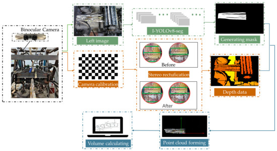 This study proposes a method that integrates instance segmentation masks and depth data to measure the sugarcane volume. The basic steps are shown in Figure 4. Binocular images of the incoming sugarcane are captured using a binocular camera, with the left image input into the proposed I-YOLOv8-seg model for instance segmentation and mask extraction. Meanwhile, depth information is calculated based on the camera parameters obtained from calibration and stereo rectification. The sugarcane mask is then aligned with the depth data to generate the point cloud of the feeding sugarcane.