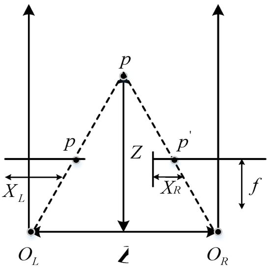 The ideal binocular stereo vision model after stereo rectification using binocular camera calibration parameters is shown in Figure 9. The calibration process uses triangulation to solve the 3D coordinates of spatial points for two cameras in a parallel configuration on the experimental platform. and represent the optical centers of the left and right cameras, respectively, is the image’s physical coordinates, and is the focal length. As shown in Formula (6), the 3D spatial information of the object surface is recovered by combining the spatial coordinate expression of the spatial point with the disparity obtained from the algorithm. In the equation, and are the principal points of the image, and is the focal length, both of which are provided by the camera calibration.