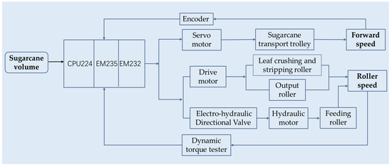 A diagram of the working principle of the conveyor control system is shown in Figure 12. The control system uses a Siemens PLC S7-200 (CPU224, Siemens, Nanjing, China), along with EM325 and EM232 modules as the core processors. It consists of four main components: the hydraulic control system, the actuating mechanism, the detection devices, and the control system itself. The hydraulic system primarily includes an electro-hydraulic proportional valve and a hydraulic motor. By adjusting the valve spool’s opening size in the electro-hydraulic proportional valve, the flow of hydraulic oil to the hydraulic motor is regulated, thereby altering the feeding roller speed. The actuating mechanism includes a servo motor and a drive motor. These motors control the speeds of the leaf-stripping and leaf-crushing rollers, as well as the output roller, by adjusting the motor speeds. The movement speed of the conveyor trolley is also regulated. The detection devices mainly consist of a dynamic torque tester and an encoder. The encoder detects the speed of the servo motor, while the dynamic torque tester measures the roller speed. During system operation, the obtained sugarcane volume information is transmitted to the PLC controller. The controller then determines whether the volume of the fed sugarcane falls within a specific range and generates control signals for the feeding roller speed, leaf-stripping and crushing roller speed, output roller speed, and transport trolley forward speed.