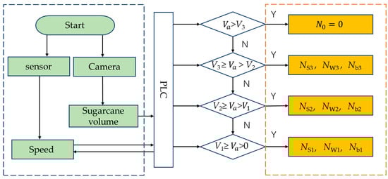 This system’s ability to significantly reduce the probability of blockage lies in the accurate relationship established between volume and speed. However, it also limits the roller speed to three fixed levels, which restricts the flexibility in adjusting the system’s operation. In addition, another key factor contributing to the significant reduction in the blockage rate is the selection of an appropriate initial speed. Since the system cannot be adjusted before the first feeding, it is necessary to collect volume data during the first feeding process. However, when the feeding amount varies significantly, the first feeding process may lead to blockage. The main cause of these issues lies in the discrete threshold-based control strategy designed in this study. The system only responds when the sugarcane feeding amount exceeds a preset threshold, and the response speed of this control strategy is relatively slow. In future research, consideration can be given to combining fuzzy logic control with PID control, dynamically adjusting based on the feeding amount and roller speeds and improving the system’s response speed.