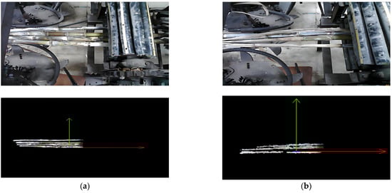 As shown in Figure 15, when no stacking occurs, complete point cloud information can be obtained. However, when stacking occurs, some point cloud information is lost. As shown in Table 10, with the increase in the amount of sugarcane fed, both the volume detection error and computation time gradually increase. The largest increase occurs when the number of sugarcane canes fed reaches three. This is due to the stacking phenomenon leading to missing point cloud information. When the number of sugarcane stalks fed reaches three or more, stacking may occur. During depth data acquisition using the binocular camera, the inability to correctly match points in the left and right views results in the loss of some depth data, causing discontinuities in the point cloud and ultimately leading to a measured volume smaller than the actual volume. After more than three sugarcanes, the gaps between stacked sugarcane stalks led to computational bias. In the actual operation process, the gaps between stacked sugarcane occupy some space in the feeding roller. As a result, these gaps, which arise from stacking, are accounted for in the volume calculation and are included in the final volume result, causing the measured volume to be greater than the actual volume.