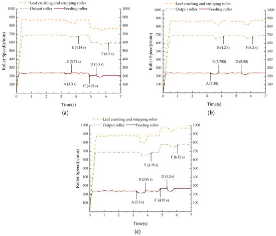 The speed change curve of each roller at different sugarcane feeding quantities: (a) 2 stalks of sugarcane; (b) 4 stalks of sugarcane; (c) 6 stalks of sugarcane.