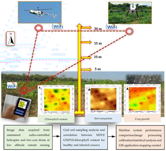 Integrating remote-controlled (RC) helicopters and drones equipped with variable-rate sprayer systems represents a significant advancement in agricultural practices, particularly for the precise management of crop diseases. This study utilizes low-altitude remote sensing platforms to monitor crop growth and disease infestation, proposing advanced technology for managing and monitoring disease outbreaks in cassava fields. The performance of these systems was evaluated using statistical analysis and Geographic Information System (GIS) applications for mapping, with a particular emphasis on the relationship between vegetation indices (NDVI and GNDVI) and the growth stages of cassava. The results indicated that NDVI values obtained from both the RC helicopter and drone systems decreased with increasing altitude. The RC helicopter system exhibited NDVI values ranging from 0.709 to 0.352, while the drone system showed values from 0.726 to 0.361. Based on the relationship between NDVI and GNDVI of cassava plants at different growth stages, the study recommends a variable-rate spray system that utilizes standard instruments to measure chlorophyll levels. Furthermore, the study found that the RC helicopter system effectively measured chlorophyll levels, while the drone system demonstrated superior overall quality. Both systems showed strong correlations between NDVI/GNDVI values and cassava health, which has significant implications for disease management. The image processing algorithms and calibration methods used were deemed acceptable, with drones equipped with variable-rate sprayer systems outperforming RC helicopters in overall quality. These findings support the adoption of advanced remote sensing and spraying technologies in precision agriculture, particularly to enhance the management of cassava crops.