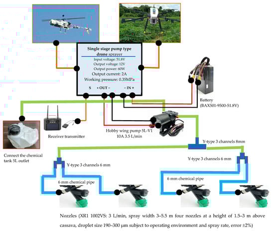 Variable rate spraying systems installed on RC helicopters and drones. Battery (BAX501-9500-51.8V; SZ DJI TECHNOLOGY Co., Ltd., Shenzhen, China), Hobby wing pump (5L-V1 10A 3.5 L/min; KASET DD 2019 Co., Ltd., Bangkok, Thailand), Receiver transmitter (72 MHz, KASET DD 2019 Co., Ltd., Bangkok, Thailand), Connect the chemical tank 5L outlet (KASET DD 2019 Co., Ltd., Bangkok, Thailand), Y-type 3 channels 6 mm (KASET DD 2019 Co., Ltd., Bangkok, Thailand), 6 mm chemical pipe (KASET DD 2019 Co., Ltd., Bangkok, Thailand), Nozzles (XR1 1002VS: 3 L/min (KASET DD 2019 Co., Ltd., Bangkok, Thailand).