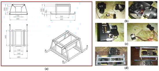 Image data acquisition system and various sensors; (a) drawing of detachable RC-helicopter skid (All dimensions are in mm); (b) true color digital (R-G-B) camera photography with servo motor; (c) G-R-NIR color-infrared (CIR) digital photography with servo motor; (d) RGB and CIR digital cameras with signal receiver were mounted on helicopter skid with unmanned radio helicopter attachment along with also seen is ground wireless remote control at frequency 72 MHz.
