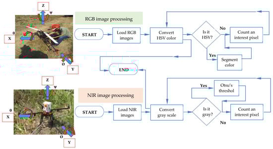 The imaging system consisted of an RGB (red–green–blue) camera (Canon Inc., Bangkok, Thailand) and a near-infrared (NIR) camera (ADC Tetracam Inc., Chatsworth, CA, USA), both equipped with wireless control (Jelsoft Enterprises Ltd., El Segundo, CA, USA), altitude sensor (Seagull Wireless Dashboard Flight System FCC 900 MHz version; Jelsoft Enterprises Ltd., El Segundo, CA, USA), and illumination sensor (two channels; central bands at 660 and 730 nm; Skye Instruments, Powys, Wales, UK). The cameras captured aerial images, which were processed to measure crop growth, density, and disease infestation. A created algorithm and a specially developed data acquisition system were used with the sprayer system. The created algorithm used in the system provided functions such as image orientation correction, geo-referencing, and analysis of GNDVI and NDVI. Calibration involved setting a one-square-meter area and scattering red-painted wood pieces at varying heights of 5 m, 10 m, 15 m, and 20 m. This method helped in calibrating the image processing system to ensure accurate data collection.
