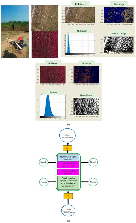 Design and fabrication of a hardware and system configuration in drone; (a) Modified RGB color and near-infrared color image segmented; (b) Sensors and system positioned.