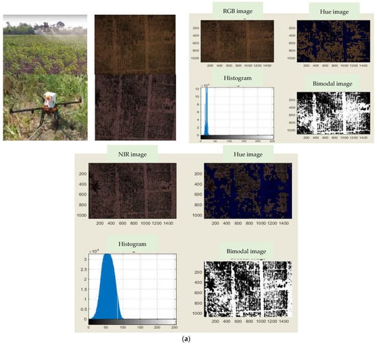 The original image had dimensions of 1536 × 1536 (height × width) at 20 m height, and a threshold value of approximately 179 pixels. The crop pixel values ranged from 8.003 to 71.999, as calculated from the image data [16,21]. A similar RC-helicopter flight was used to capture data from a NIR camera for the crop growth values, as shown in Figure 15b. The calculated crop pixel values ranged from 18.005 to 77.995 [2,24].