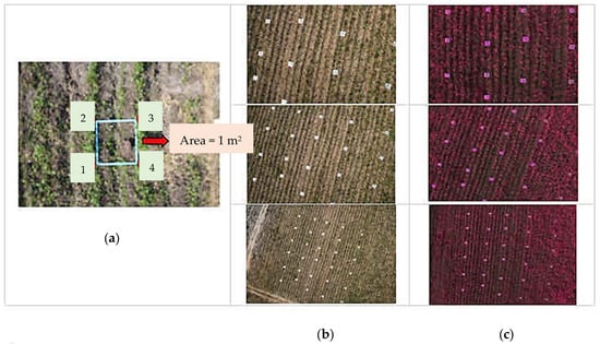 To apply variable-rate fertilizer and chemicals, an injection system was precisely moved overhead with a straight alteration pattern above the cassava plantation. The system was controlled by RGB/NIR-modified cameras, which had the best resolution of 1 m × 1 m at 1.2 m above the plantation. The flight height was selected based on an appropriate coverage of the region of interest (ROI) on the field with plants.