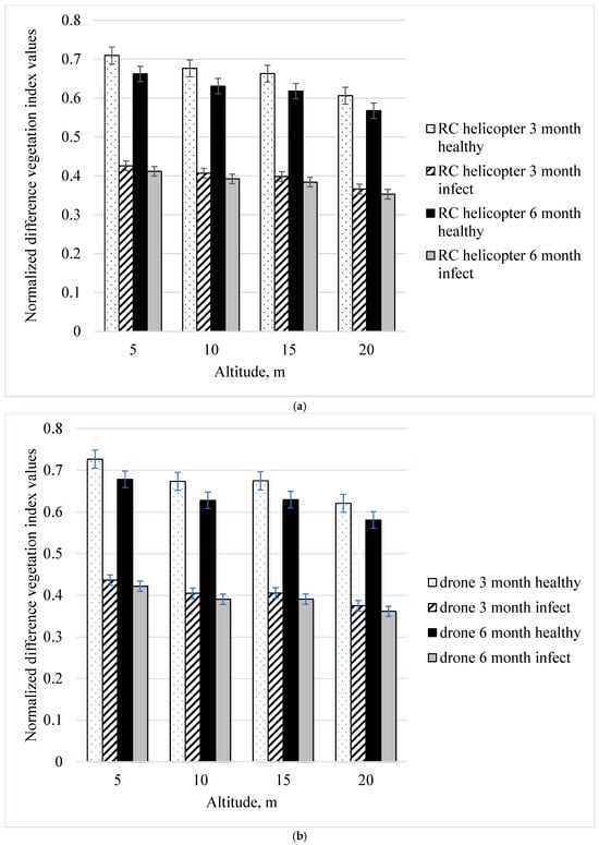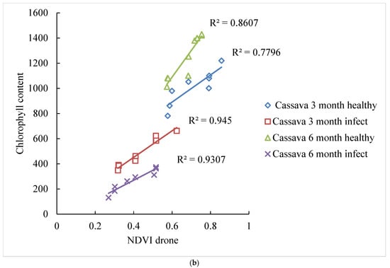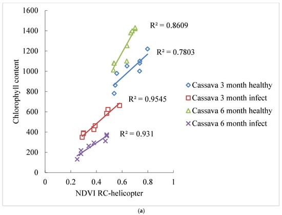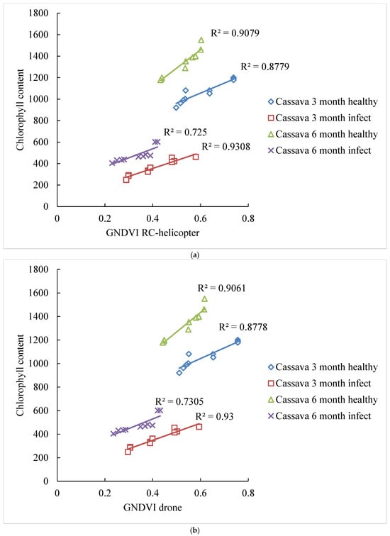 Estimation of leaf chlorophyll content using the green normalized differential vegetation index (GNDVI) for healthy and infected cassava crops: (a) RC helicopter-mounted; (b) drone-mounted.