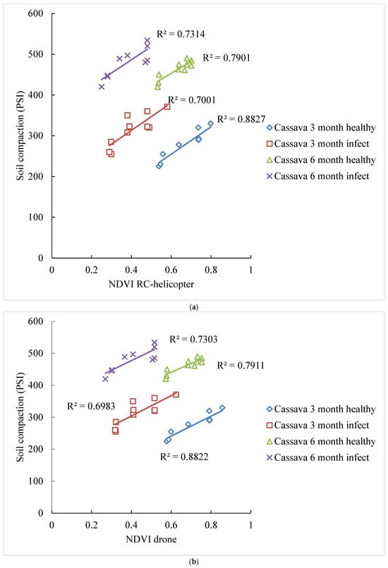 Soil compaction data with different growth stages in cassava plantation: (a) RC helicopter-mounted; (b) drone-mounted.