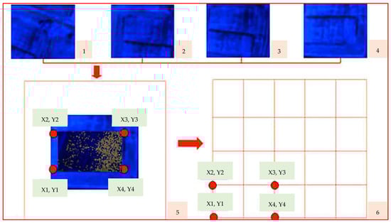 Georeferencing methods involve combining plot-based images from an RGB/NIR-modified camera with information from a GPS receiver sensor. The images were acquired by RC helicopters and drones and may have inaccuracies due to GPS signal strength and accuracy. From Figure 12, to address this issue, each frame of the image (1, 2, 3, 4) is manually combined using markers (Xi,Yi). The algorithm then trims excess areas beyond the ground margins and corrects the images for altitude (5). The true ground coordinates serve as reference points to combine all images into a matrix (6), which generates a combined image [24,27]. This final image is used for further analysis and converted to GIS map layers.