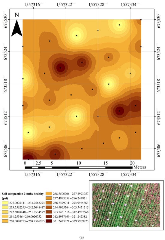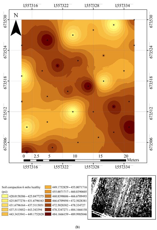 Soil compaction data, mapped using geostatistical analysis, revealed that optimal cassava growth occurs at soil compaction levels above 321 psi (Figure 13a). At this soil compaction, the recorded values for healthy and infected levels fall in the range of 225 to 329 psi and 255 to 370 psi, respectively, after 3 months [24,26]. Similarly, at this soil compaction, the recorded values for healthy and infected levels fall in the range of 420 to 489 psi and 420 to 533 psi (Figure 13b), respectively, after 6 months. The study confirmed a direct relationship between soil compaction and cassava growth, with healthy plants showing higher growth rates at these compaction levels. This finding is crucial for effective pest control and agricultural management.