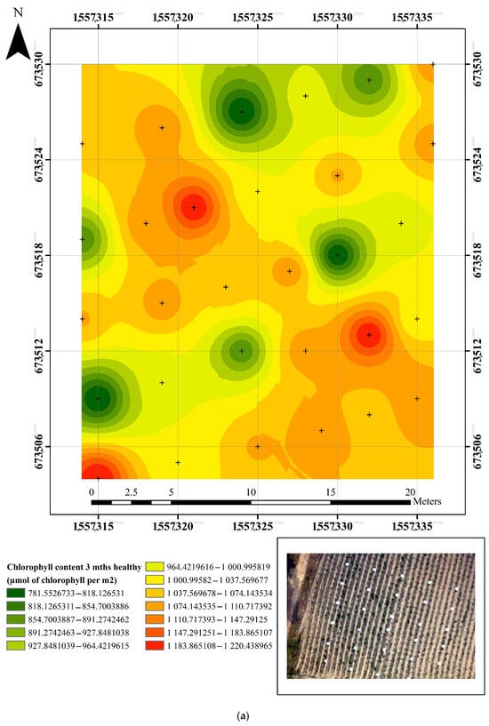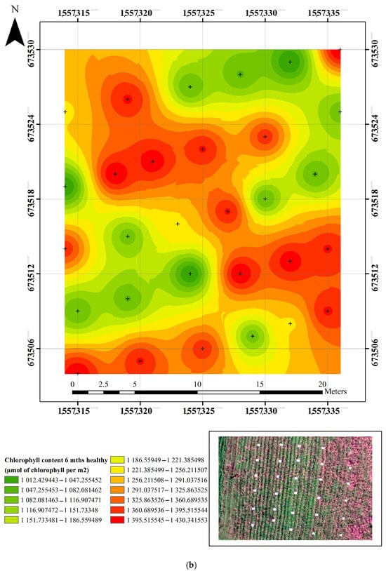 At an altitude of 20 m, leaf reflectance from the drone mounted system varied from 781 to 1220 µmol m−2 for 3-month-old healthy cassava, and 348 to 662 µmol m−2 for 3-month-old infected cassava [24,26]. Similarly, the chlorophyll content distribution for 6-month-old healthy cassava was recorded between 1012 and 1430 µmol m−2, and for infected cassava, it was between 131 and 374 µmol m−2 (Figure 14b).