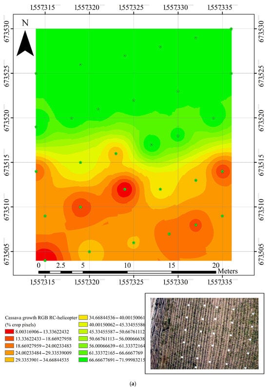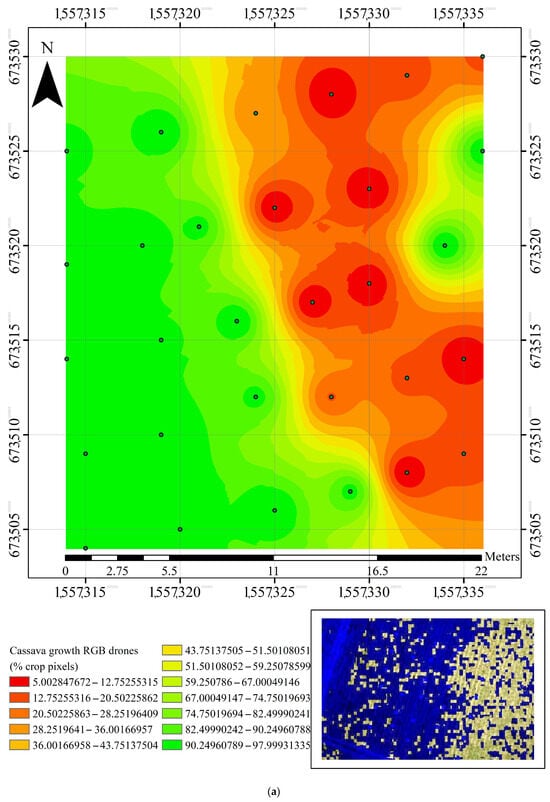 Interestingly, young and vigorous cassava plants tend to be less healthy than older vigorous ones, as indicated by higher R2 values, despite potential errors due to smaller canopies. Additionally, high soil compaction levels lead to reduced planted surface areas. However, images from both cameras provide near real-time results that are sufficiently accurate to develop a plant index and differentiate between growth density and infected plants, regardless of their growth stage. Compared to other methods, this approach could be particularly beneficial for medium to large-scale cassava growers and shows promise for application in other crops as well [19,20,21,22].