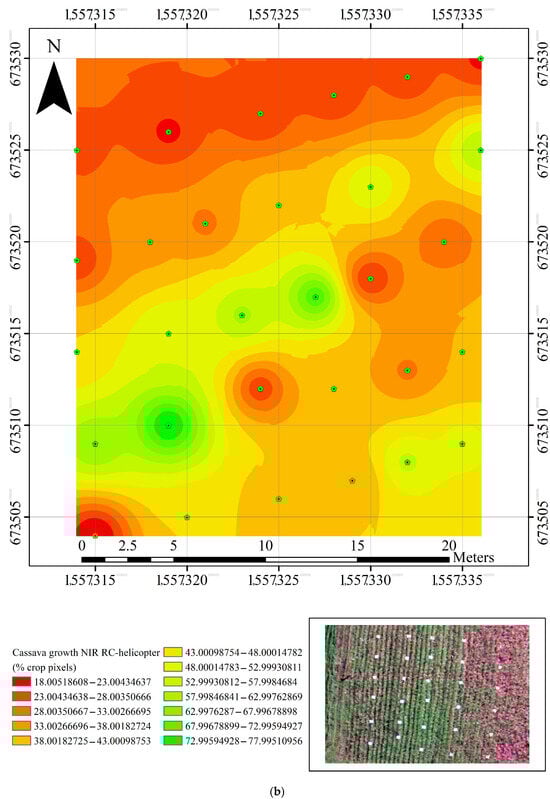 Images captured by RC helicopters and drones equipped with RGB and NIR cameras were used to map crop growth variations in cassava fields. The data showed that crop pixel values varied significantly depending on the camera type and altitude, with NIR cameras providing more accurate assessments of crop health (Figure 15a).