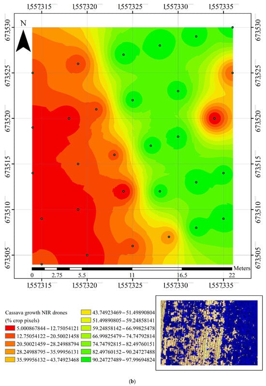 The RGB camera mounted on the drone also captured the distribution of crop growth values in cassava plantations (Figure 16a), at 20 m height, and provided similar dimensions of the original image (1536 × 1536; threshold value of 179 pixels). The calculated crop pixel values ranged from 5.002 to 97.999, as determined from the image data [7,16]. Similarly, data collected from an NIR camera mounted on the drone (Figure 16b) showed the calculated crop pixel values ranged from 5.008 to 97.996 [4,10,13].