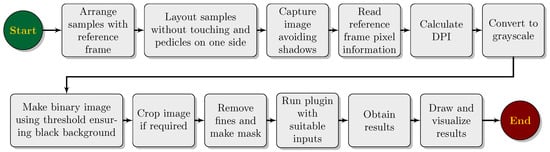 The developed computer vision image analysis plugin utilizes the Java language and Fiji (Ver. ImageJ 1.54p; http://fiji.sc/Fiji; accessed on 25 June 2025) package. Fiji is an image processing package and is a distribution of ImageJ, an open-source, free image analysis program [27,28]. It is quite popular among scientists working with biological imaging [29]. Fiji is a feature-rich integrated development environment of ImageJ that offers various commands for plugin development [30]. Researchers have developed custom-made ImageJ plugins to address diverse computer vision applications. Some of the examples are food grains dimensions [2]; morphological characterization of particles [31]; blood vessel diameter measurement [32]; and several more. These plugins played a role in advancing scientific research in these areas.