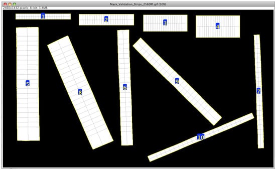 Multiple-width-measurement validation using drawn rectangular blocks (1–4) and cut paper strips (5–10) of known dimensions (DPI = 256; 20 measurements; 10% end caps; and labels indicate the object numbers allocated by the plugin scanned from the top to the bottom).