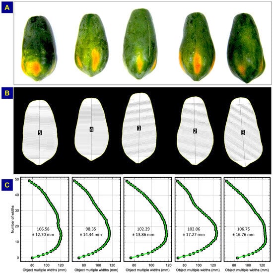 An example of multiple and mean dimension measurements, with papaya (Figure 1l) as an illustration from the agricultural produce studied (Figure 1), is presented in Figure 6. The original color image (Figure 6A) was duplicated to make a binary mask during preprocessing stages, during which the length and multiple widths were measured and drawn (Figure 6B). The plugin was run with the loaded binary of the papaya and the default values (DPI from image = 109, both end chop % = 10.0, and number of multiple widths = 50) of the plugin (Figure 4C), with some user inputs (uncheck rotating the profile). The length and multiple widths of each sample of the papaya image are plotted and labeled (Figure 6B).
