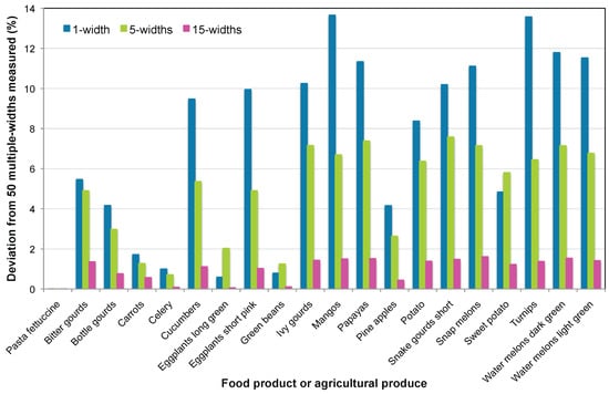 With 50 multiple-width measurements were used as references, the deviations of 1, 5, and 15 width measurements for mean width determination were evaluated, and they are plotted in Figure 7. As anticipated, the deviations decreased from 1 to 5 widths and were drastic for 15 widths compared to 50 widths. On average, these deviations were 7.2% ± 4.7%, 4.7% ± 2.6%, and 1.0% ± 0.6%. It can also be seen that elongated samples (low ratios), such as pasta fettuccine, carrot, celery, long green eggplants, and green beans, exhibited deviations of <2%. Therefore, based on these results, the general recommendation is to use 50 width measurements for optimal profile representation and to obtain the mean width. Alternatively, approximately 15 width measurements can be used for a satisfactory representation, with a mean width estimation deviation of approximately 1% for the 50-width-measurement reference. However, for new untested produce or products, preliminary measurements will reveal the optimum number of multiple-width measurements (a; Table 3) to be considered for the most effective representation.