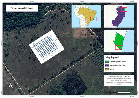 The experiment was performed on flat terrain, previously used as a pasture, belonging to the Experimental Farm of the University Center of Northern Espírito Santo, Federal University of Espírito Santo (CEUNES/ UFES), located at the São Mateus Campus, in the northern region of Espírito Santo State, Brazil (latitude 18°40′25′′ S, longitude 40°51′23′′ W and altitude of 37.0 m above sea level) (Figure 1). The experimental area was situated within the Atlantic Forest biome. The climate of the region is classified as a hot and humid type Aw, according to the Köppen classification, characterised by a dry season from autumn to winter and a rainy season from spring to summer, with an annual average temperature of 24.2 °C and annual precipitation exceeding 1240 mm.