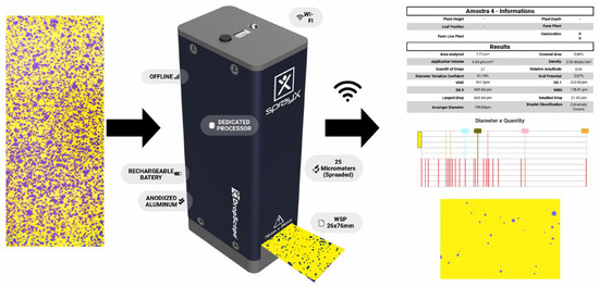 The quantification and characterisation of impacts on each water-sensitive paper tag were performed immediately after each application and after the tags had dried, using the DropScope® wireless system (SprayX, São Carlos, Brazil), composed of specific applications and a wireless digital microscope, equipped with a high-resolution image sensor (above 2500 dpi) (Figure 3). This system enabled the estimation of partially overlapping droplets with the diameters of approximately 35 µm. The following parameters were evaluated: volume median diameter (VMD, µm), droplet density (droplets cm−2), coverage (%), diameter at which 10% of the sprayed volume is composed of smaller droplets (D0.1, µm), and diameter at which 90% of the sprayed volume is composed of smaller droplets (D0.9, µm).