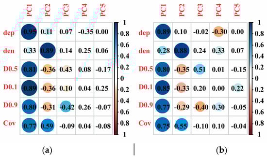 Correlation between spray parameters and principal components. (a) Flight height 3.0 m; and (b) flight height 4.0 m.