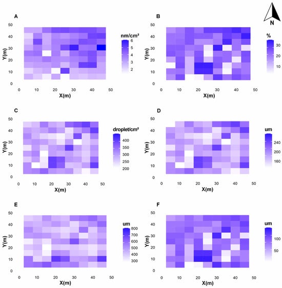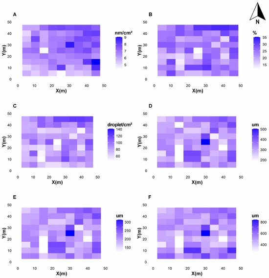 Spatial distribution for the studied spray parameters at flight height 4 m. (A) Dep: spray deposition (µL cm−2); (B) Cov: spray coverage (%); (C) Den: droplet number density (droplet cm−2); (D) D0.5: diameter of the volumetric median (µm); (E) D0.1: droplet diameter with volume below 10% (µm); and (F) D0.9: droplet diameter with volume below 90% (µm). Please note the different scales for different properties.