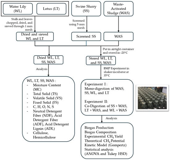 The inoculum used in this study was obtained from a mesophilic anaerobic digestion reactor treating swine slurry. Prior to experimentation, the inoculum was degassed to remove residual biogas [,]. The substrates for the biochemical methane potential (BMP) assays included swine slurry, waste activated sludge (WAS), and dried biomass of water lily (Nymphaea spp.) and lotus shoots (Nelumbo nucifera). Swine slurry was collected from a pit-type experimental housing facility. Water lily and lotus plants were cultivated using treated swine wastewater effluent from the Suwon experimental farm at Seoul National University, Republic of Korea. Biomass samples, consisting of dried leaves and stalks, were ground and passed through a 1 mm mesh sieve prior to use. WAS was collected from the sedimentation tank of a swine wastewater treatment system comprising anoxic and oxic reactors, a sedimentation tank, and a filtration unit. Characteristics of the inoculum and swine slurry were referenced from previously published data [].