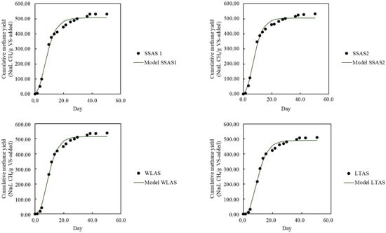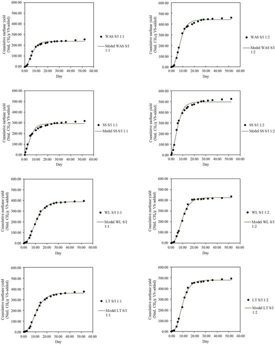 The first-order kinetic model exhibited a poorer fit compared to the modified Gompertz model. The Gompertz model is particularly well suited for biochemical methane potential (BMP) assays, as it accounts for the lag phase—an essential parameter when digesting complex organic substrates []. Therefore, kinetic modeling in this study was performed using the modified Gompertz equation (Equation (7)).