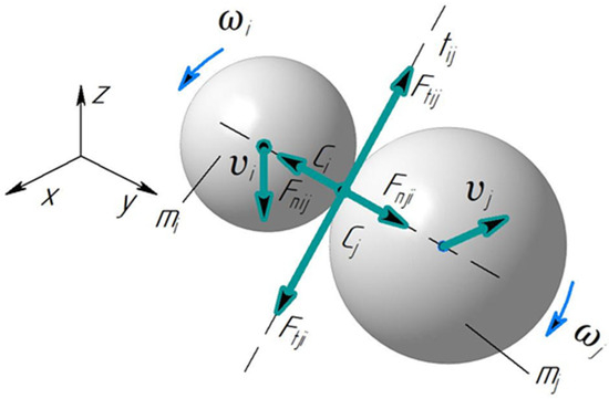 A diagram of discrete particle interactions. i, j—indices of spherical particles; ωi, ωj—angular velocities of particles i and j, s−1; mi, mj—masses of particles i and j; Ci, Cj—centers of gravity of particles i and j; Fnij—normal contact force from particle i to particle j, N; Fnji—normal contact force from particle j to particle i, N; Ftij—tangential force from particle i to particle j, N; Ftji—tangential force from particle j to particle i, N; υi, υj—linear velocities of particles i and j, m/s.