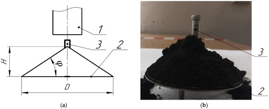 Device for determining angle of natural slope: (a) diagram: 1—cylindrical funnel; 2—base, 3—rod; (b) photo: D—base diameter, mm; φ—angle of repose, degrees.