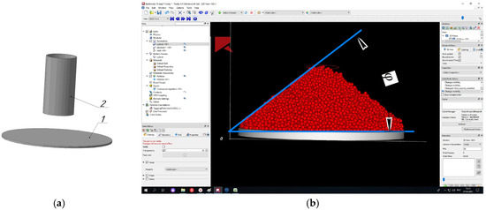 Measuring the angle of natural repose. (a) A 3D model of the cylindrical funnel and the plane; (b) measurement of the angle of repose.