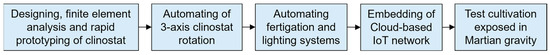 Step-by-step process flow of developing Cloud-enabled multi-axis soilless clinostat for Earth-based simulation of partial gravity and light interaction in seedling tropisms.