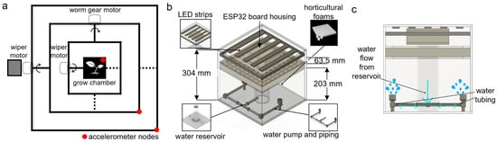 (a) Top view line structure of the 3-axis clinostat; (b) placement of lighting and fertigation components; and (c) direction of water flow from reservoir to the root zone inside the grow chamber.