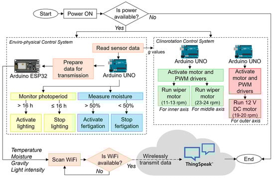 The entire clinostat system is connected to a Cloud-based IoT network to support the seamless virtual monitoring of the end user and allows historical controlled environment data to be recorded for future analysis. Provided in Section 2.2 and Section 2.3 is the same Arduino UNO board (ATmega328P, 5 V logic, 16 MHz) that is cascaded with an ESP32 NodeMCU WiFi (dual-core Xtensa® 32-bit LX6, 2.4 GHz, 3.3 V logic) microcontroller breakout board for wirelessly transmitting temperature and humidity (DHT11, accuracy: ±0.5 °C, ±2% RH), Arduino-based capacitive moisture, gravity (MPU-6050 accelerometer), and Grove light intensity data inside the grow chamber to ThingSpeak and the Create IoT online platform (Figure 3). The microcontroller allowed acquisition and transmission of sensor data per minute; that is a data rate of 16.667 mHz.